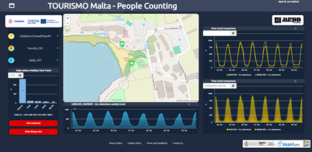 The dashboard TOURISMO Malta – People Counting, which contains data from sniffer devices, is divided in three main areas: