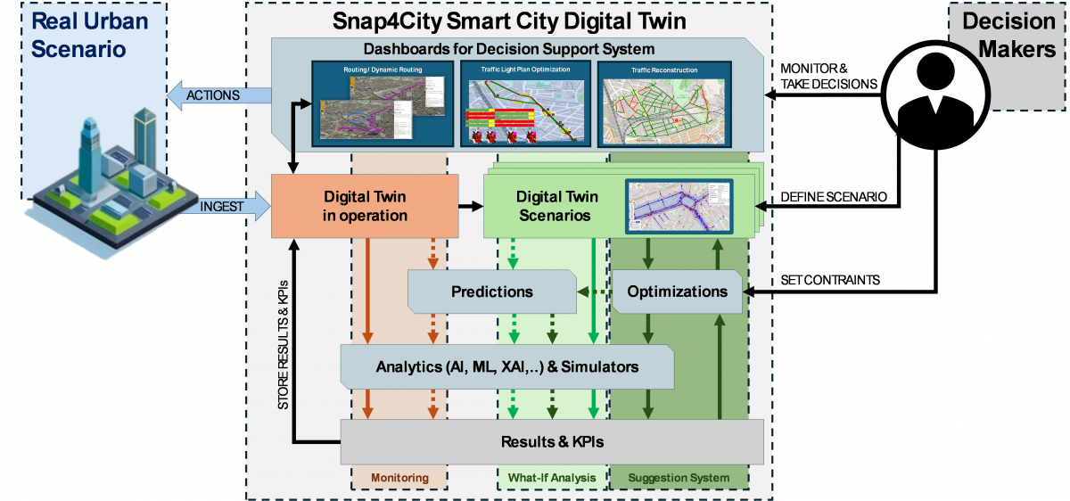 The formal modelling of Scenarios, and the corresponding execution of analytic processes (for computing prediction, simulation, with classic tools as well as AI supported), may be used to perform automatic or semi-automatic optimizations. This implies generating changes and producing Optimized Scenarios taking into account some specific KPIs. In this context, it can be needed to exploit multimodal simulation capabilities of the digital twin (traffic, people flow, energy, etc.). The Optimized Scenarios have the same data model of the Scenario while they present/propose changes from the computation, for example, changes in the road graph, changes in the road parameters, etc. The production of Optimized Scenarios implies to propose/suggest changes to Decision Makers via a suitable interactive user interface (human in the loop [25]). The approach of generating optimized suggestions goes beyond the what-if analysis, that is typically limited to work on manually identified cases/scenarios. Suggestion generation by optimization (dark green part in Figure 1) is designed for activities performed in tactic and strategic planning at medium and long range.