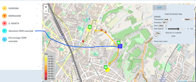 The first one is about absolute values and the other percentages of visitors that in the specific chosen time displayed on the top right part of the map traversed into or out the specific area monitored by the sensor. In this case the Area of Interest has been taken from MGRS in reality the are is a circle of 50mt of ray.