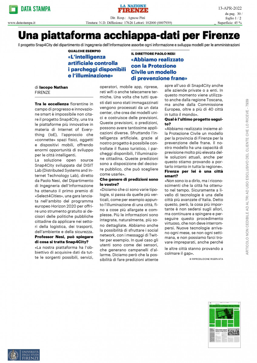 La soluzione open source Snap4City sviluppata dal DISIT Lab (Distributed Systems and Internet Technology Lab), diretto da Paolo Nesi, del Dipartimento di Ingegneria dell'Informazione ha ottenuto il primo premio di «Select4Cities», una gara lanciata nell'ambito del programma europeo Horizon 2020 per offrire uno strumento gratuito ai decisori delle politiche pubbliche cittadine da applicare nei settori della logistica, dei trasporti, dell'ambiente e della sicurezza.