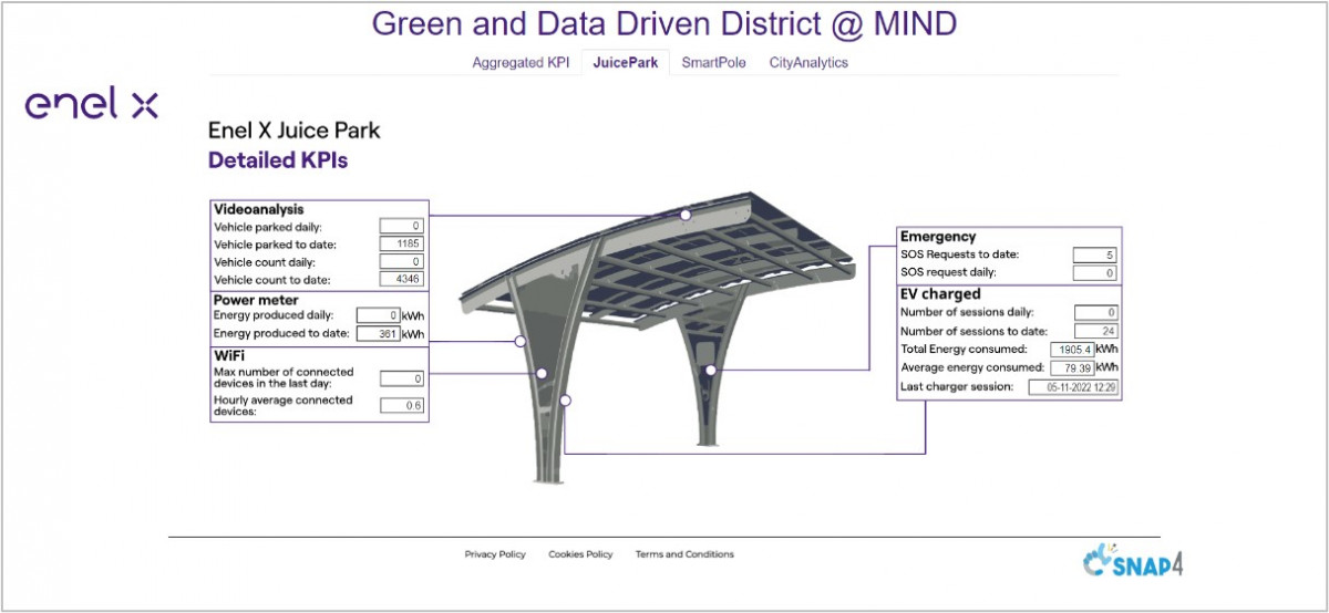 Thanks to the support of SNAP4 company and by exploiting the Snap4City capabilities, public web dashboards showing the harmonized data collected by the sensors present on the devices have been implemented, also by showcasing analytics data related to the EXPO area in Milan. The solution demonstrates the possibility to make effective use of sensors’ data coming from smart recharging stations by providing decision support tools based on data related to: energy consumption with respect to the energy produced by the integrated PV panels, people and vehicle counting and tracking, parking monitoring, e-bikes and e-cars recharging sessions monitoring, people counting on the basis of the Wi-Fi connections, video analysis for people counting and to detect the presence of people in forbidden areas or un-appropriate people behaviour. The solution also integrates information regarding the use of the integrated SOS requests system and of the integrated Automated External Defibrillator (AED) life saving device.