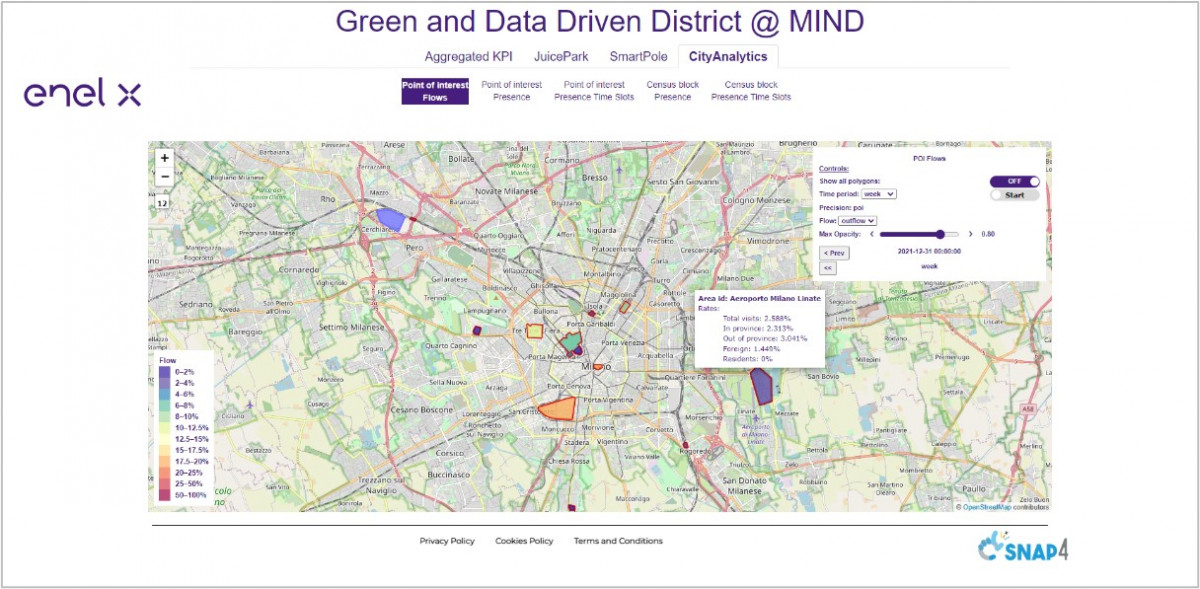 Moreover, a business intelligence tool for analysing the data related to the presence over time at the Milan EXPO area has been implemented. On the basis of the actual historical data available about people presences, people proveniences and people origins/destinations, a visual tool has been implemented by exploiting the Snap4City technology. The smart application developed represents in a map the visual analysis of the data in details allowing to navigate in the data with a most satisfactory experience, enabling decision makers to have an insight into the data related to the presence of people in the EXPO area. An effective tool allowing to support decision makers for urban services planning on the basis of the real demand, through an estimation of the presences of people and mobility flows.