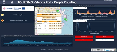 The dashboard TOURISMO Valencia Port - People Counting, which contains data from installed devices at the port, is divided in three main areas: