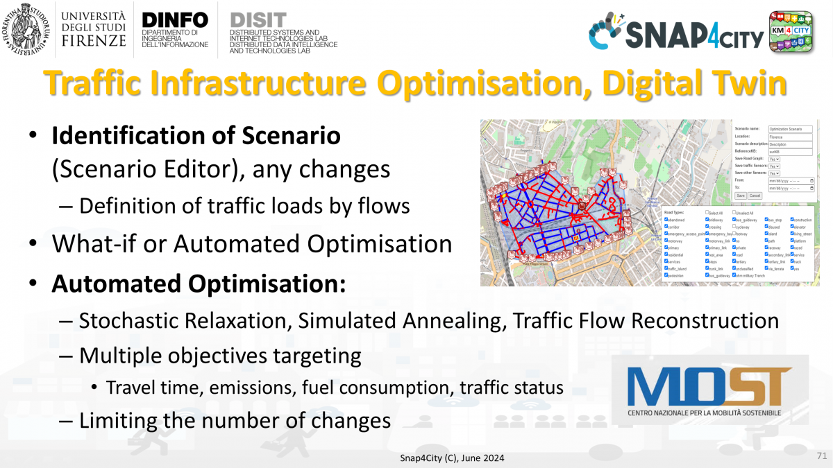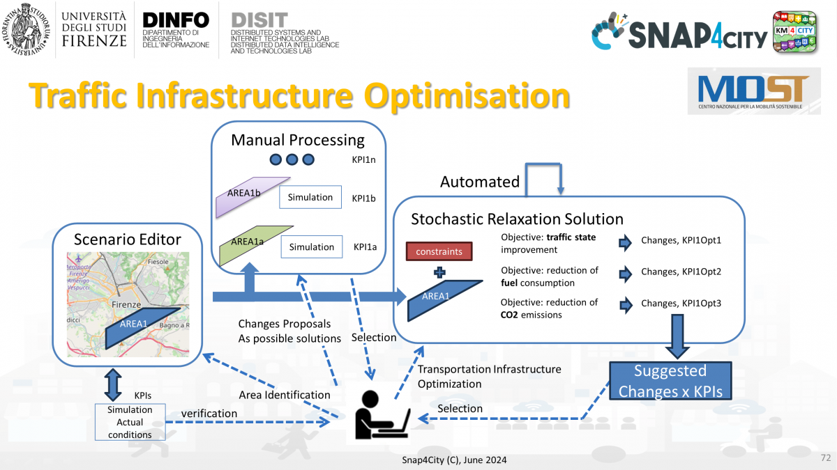 The optimisation solution exploiting functionalities of the Open Source Snap4City platform allows operators to define an area via a polygon to define a scenario and test manually possible modifications to the road infrastructure in response to the requirements of municipalities and governments on improving the mobility on some parts of cities and urban context. The manual operation allows the operator to monitor specific objective functions that can be defined based on the traffic densities reconstructed exploiting the values from traffic sensors if present in the platform of typical time trends based on road category.