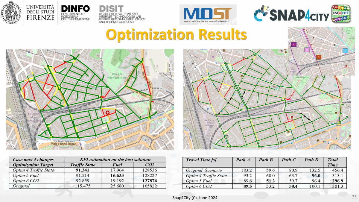 - specifies and computes a set of KPI objectives: fuel consumption, congestion levels, CO2 emissions, and travel time over specific paths in the scenario.
