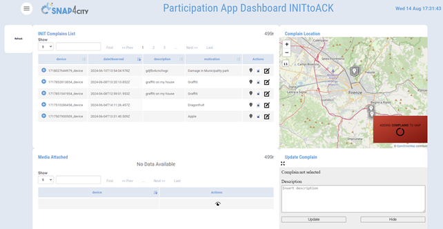 Snap4City provides a number of solutions for collecting complains / suggestions from city users via mobile and web Apps (mobile App of the “in a Snap” series). They can be anonymous or authenticated. The complains are typically classified and the user can tick one of them. Each complain can include a media (image or video), a description, the date and time, GPS coordinates, etc. The complains are collected by the systems and can be managed by the operators on view / dashboard according to their state, for example: init, ack, proc, closed. The advantage of providing a complain by means of a registered user may imply for the user to receive acknowledgements of the complain provided and its eventual addressing, and change of status (notifications can be sent via mobile apps and/or via email). Example of classified motivations are: Abandoned vehicle in a public right of way, Dead animal, Lost/unattended pet, Graffiti, Illegal dumping (garbage, debris, junk, etc.) on public property, overgrown vegetation, Parking enforcement, Damage or maintenance issues in Municipality parks, Street Pothole, Public litter, Street sign and traffic signal damage/malfunctioning, Streetlight outage or damage, Other General inquiry to the Municipality, etc.