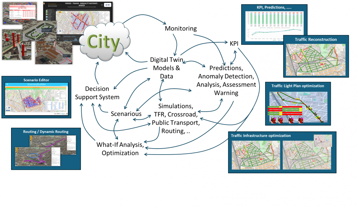 The main motivations optimization and what-if analysis targets are the decongestions of traffic and services, improvement of quality of public transportation services, and the quality of life. For example, traffic decongestion can be obtained by reducing the number of vehicles in crowded conditions, which also implies the reducing of emissions, changing/forcing the routing, optimizing the semaphore cycles, etc.; making mobility services more accessible would be obtained by providing more rides or different paths of public transportations and in some cases increasing emissions and expenses. Thus, tradeoff among conflicting targets have to be identified. For this reason, a scenario editor is provided [2], and a large range of interactive visualization tools have to be used for showing the effects and results to work with the decision makers and collect from them final decision and eventually suggestions in short time [3].