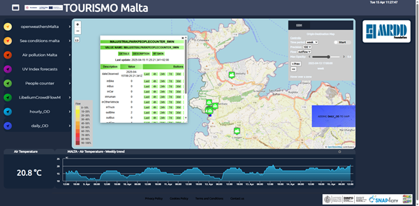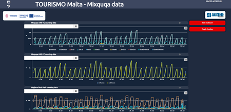 The dashboard TOURISMO Malta – People Counting, which contains data from sniffer devices, is divided in three main areas: