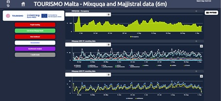 The dashboard TOURISMO Malta – Mixquqa data contains the monthly data trends from data cameras devices and the Mixquqa beach and Majjistral park for comparison. A specific period can be selected by entering a date in the calendar in the top left corner.