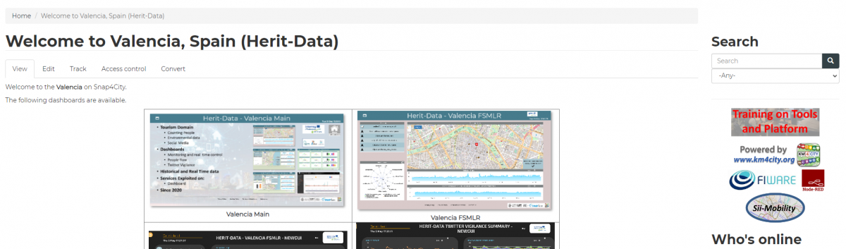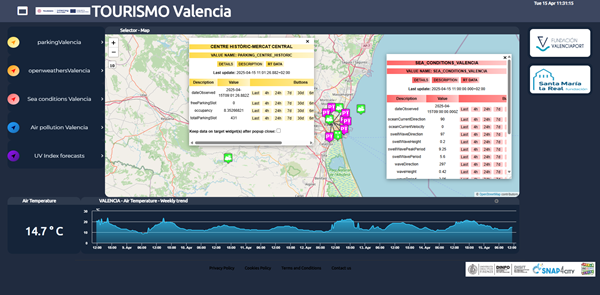 Two buttons are also available in the main dashboard, each of them opening a specific dashboard with trends and metrics from the internal sensors in the Museum of the City and in La Lonja.