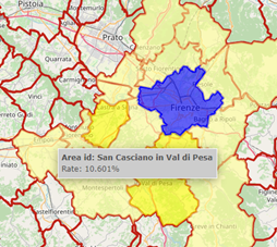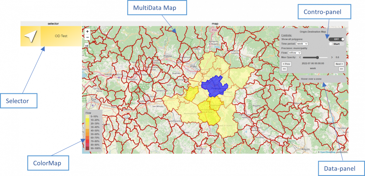Under the control-panel, a data-panel is shown: here information about the flows for the selected area are reported. Alternatively, such information can be presented in a popup-panel over the selected area.