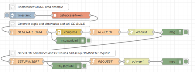 In Snap4City ODM can also be ingested using Node RED flow in the Snap4City IoTApp. As anticipated, at this moment is not possible to use in Node RED the /buildcompressed endpoint for MGRS areas and the /buildcommunes endpoint for the GADM area, due to technical difficulties in replicating the NumPy compression in Node RED. Differently, it is possible to use the /build endpoint for the MGRS, and the /buildcommunes for the ISTAT and AOI areas, since the former do not use compression and for the latter, that use compression, e a special case has been devised in the OD-BUILD API.