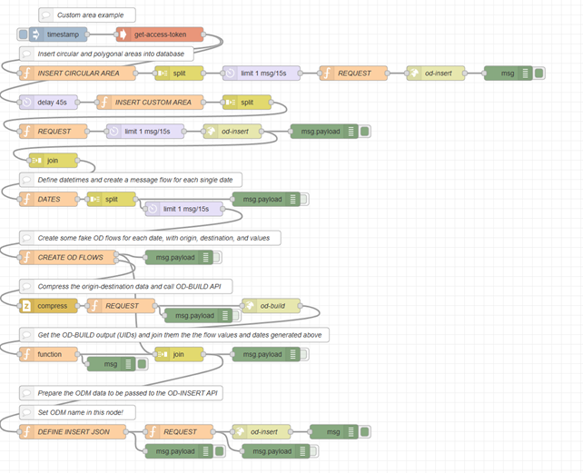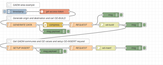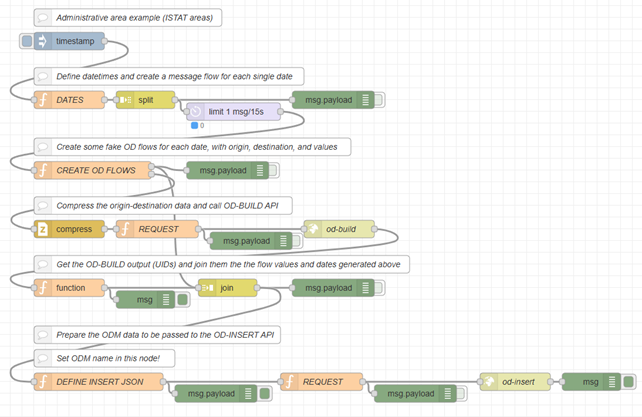 - In CREATE OD FLOWS, simulated flow for a series of origin and destination areas (the municipalities of the province of Florence) are generated with random flow values. In this node areas ID are used to create the message buffer structure to pass to the OD-BUILD API. Dates and values are instead outputted on a different flow (they will be recollected after with the JOIN node).