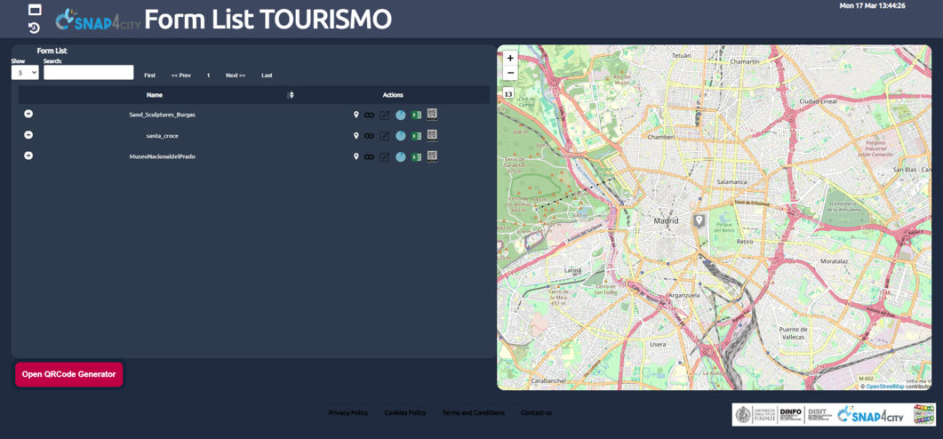 the QR code management solution is granted via a tool which allows you to connect any kind of forms, generate a QR code, and use it for your banners and flyers in the city.