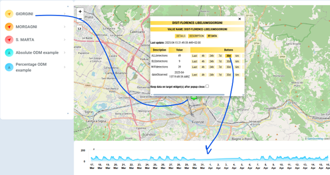 The first one is about absolute values and the other percentages of visitors that in the specific chosen time displayed on the top right part of the map traversed into or out the specific area monitored by the sensor. In this case the Area of Interest has been taken from MGRS in reality the are is a circle of 50mt of ray.