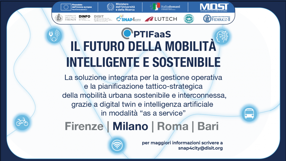 OPTIFaaS, flagship del CN MOST, powered by Snap4City, fornisce soluzioni in ambito mobilità e trasporti per la gestione operativa e la pianificazione tattico strategica tramite Digital Twin e modelli di AI, con supporto alla what-if analysis, simulazione ed ottimizzazione.