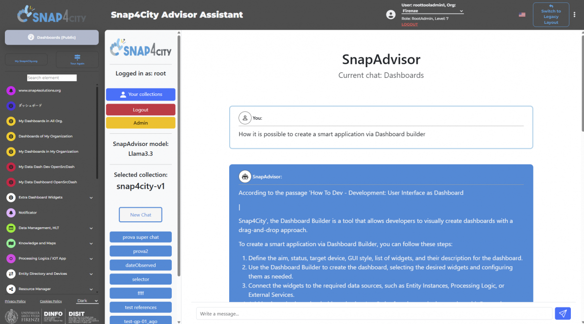 - Sna4CityAdvisor: for developers and promoters knowing all Snap4City and DISIT Lab literature, articles, manuals, slides, codes, etc. The SnapAdvisor with this skill is
