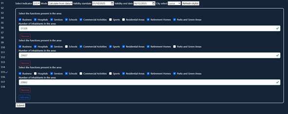 In Figure 2 an example of Calculate from data modality is provided for SUMI S15. Indicator 15 assesses the diversity of functions within the area. To calculate it, the territory must be divided into zones in which the presence of various functions is evaluated. The interface allows users to add different zones using the “Add area” button at the bottom left. For each zone, the user must select the services available and enter the number of residents. Each added zone can be independently removed using the “Remove” button below. After filling the information, data are sent to the backend and S15 is automatically computed.