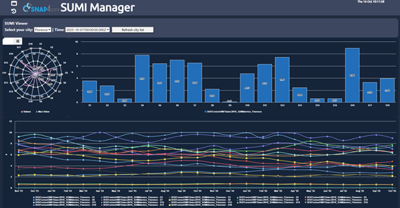 In Figure 1(a) the inserted SUMI can be visualized. After selecting the city of interest and the reference datetime, the manager retrieves the data from Snap4City and present it using a kiviat and histogram of the specified SUMI instance, and a time trend illustrating the evolution of SUMI over time for that city. Such a visualization exploits all the interactivity of the dashboard widget offered by Snap4City allowing the user to interact and inspect the plots.