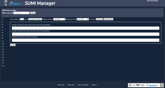 - Direct entry: the user enters directly the SUMI value for each indicator and after clicking on submit the data are stored into Snap4City, ready to be visualized.