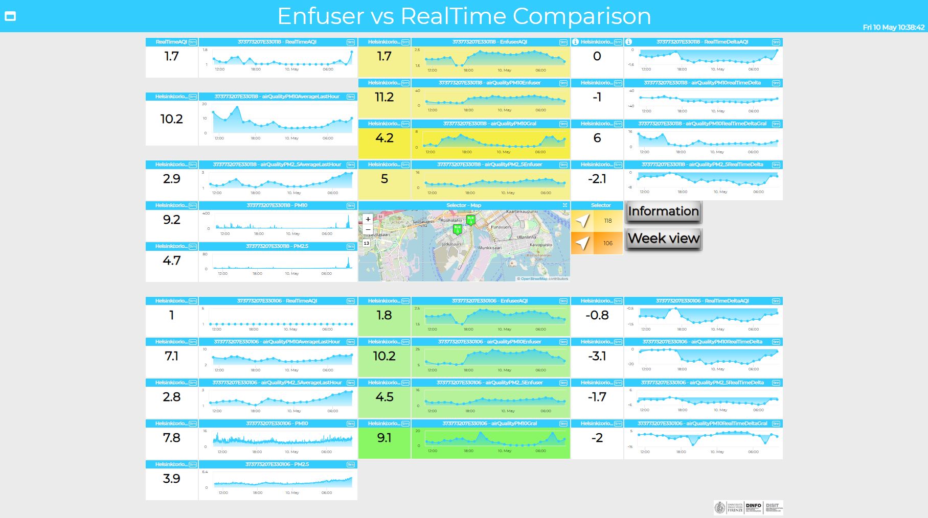 - RealTimeDeltaAQI: difference between the real time hourly value and the enfuser value of the Air Quality Index and daily/weekly trend of the differences updated every hour.