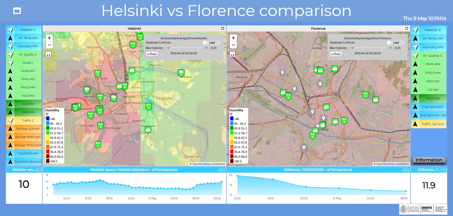 This dashboard called "Helsinki vs Florence Comparison" has been designed to provide an overview to the city officials or users about a comparison between the city of Helsinki and Florence. This dashboard allows to control in the same time data from the same kind of sensors in the cities of Helsinki and Florence to have a complete view on simialr parameters in the cities. The dashboad has been produced by Snap4City team, you can find more and more information on Https//www.snap4city.org