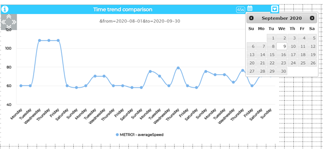 (esempio del trend MonthWeek in riferimento al device METRO11 ed al sensore dell’averageSpeed. Il periodo di interesse è di 2 mesi, la data di riferimento è il 12/10/2020