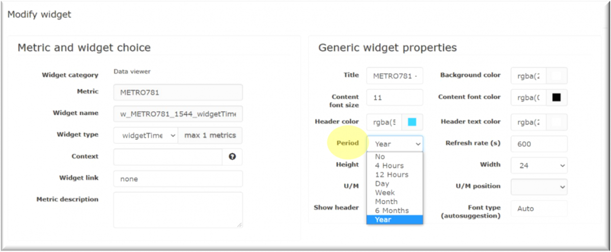 In particular, the Period dropdown menu is available for specific widget types that represent values showed in a period of time: