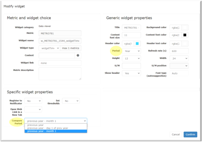In the Specific widget properties box it is possible to specify the Compare Period, according to the selected period: