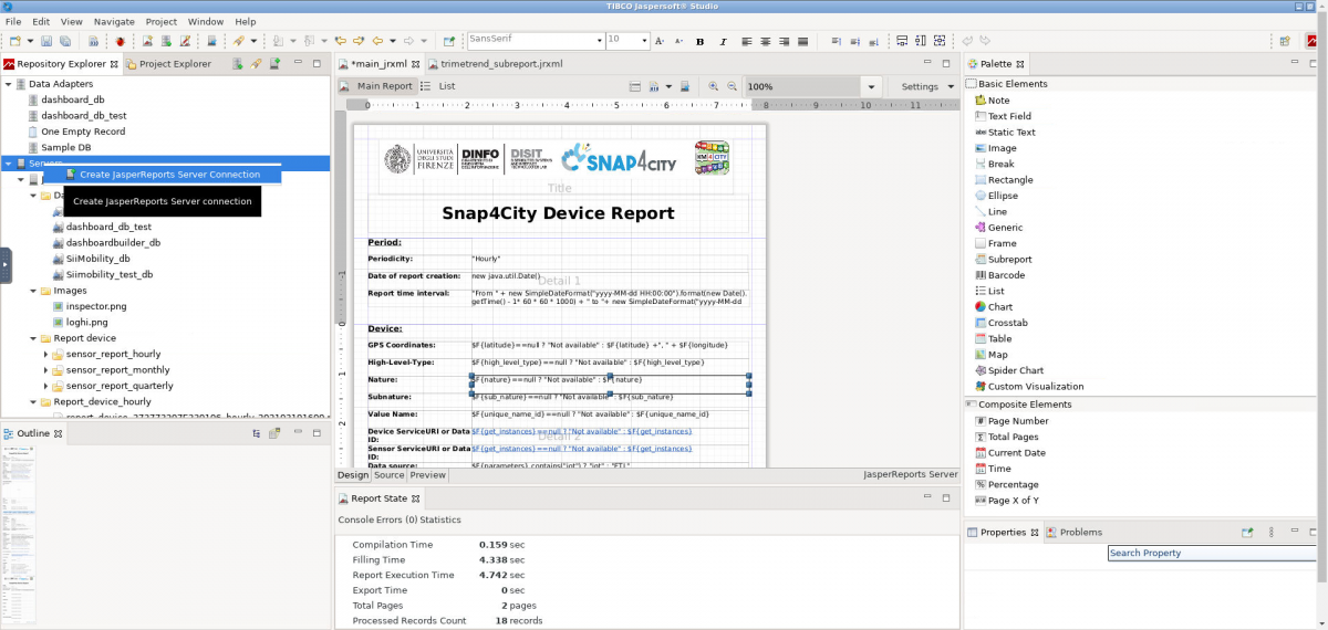For the report generation and management, Snap4City integrates the open source reporting engine TIBCO Jaspersoft.