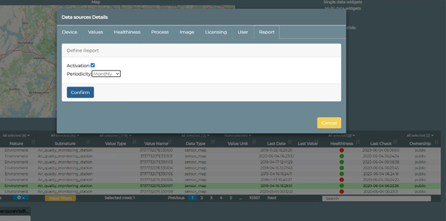 In the Data Inspector interface, by clicking the colored point in the Helthness column, it is possible to access to the Data Inspector modal menu. In particlar, in the Report tab the user can activate or deactivate the activation of a job of the scheduler inherent to the specific device selected and set the time interval for the report generation. By clicking the Confim button, this command activates a REST API request in the JasperReport Server that creates the job scheduler, it sends to the server the parameters with the name of the device, the information regarding the name of the files to be created and the destination table (defined in a specific configuration file in the Snap4city tool) and the metadata on the time interval of the scheduling, such as the start date of the creation of the files.