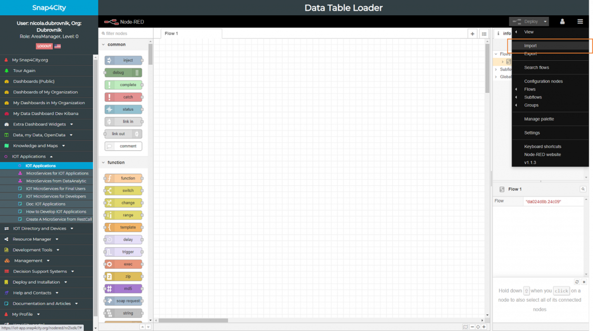 To setup a Data Table Loader (or POI) IoT application for a user, associated with an organization (assuming that the IoT application code is available (for example, in the clipboard or in JSON format), the following steps are needed to be followed:
