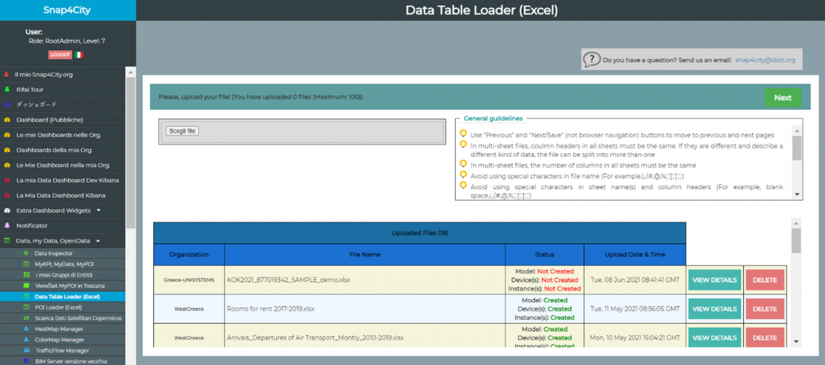 - Delete the file and the data created on Snap4City: (by clicking on “DELETE” button). This functionality is available only if the associated instances have not yet been created.