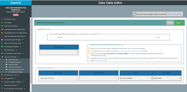 In this step, the user is asked to compose a value name for the uploaded file. A value name will be used to identify an IoT device. Therefore, as suggested in the provided guidelines, a proper value name is composed of a set of column headers that could be used to identify the IoT device. By default, the file name and the sheet name, chosen in the previous step, is included in the composed value name. It is noted that, if there is a dateObserved for each row, this step is skipped. A set of guidelines is provided to the user for composing value name directly on the tool.