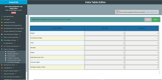 In this step, for each column header, the user is asked to insert a value type and an associated value name. If there is no proper value type or value name for a column, the user needs to contact snap4city platform (mail to: snap4city@disit.org).
