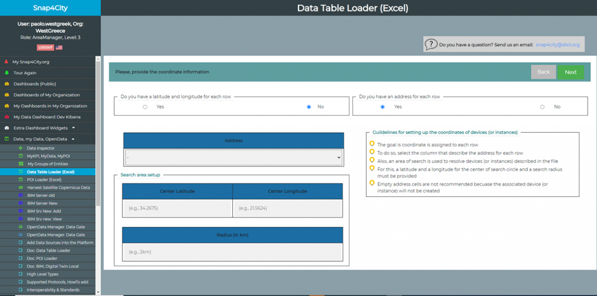 the radius of the search circle A possible coordination is then returned by the tool which can be viewed in the preview table in the next step. It is noted that in the Address case, if there is no address provided for a row, the associated device/instance will not be produced (later by an IoT App). A set of guidelines is provided, to the user for setting coordination in both File, Address, and Row cases.