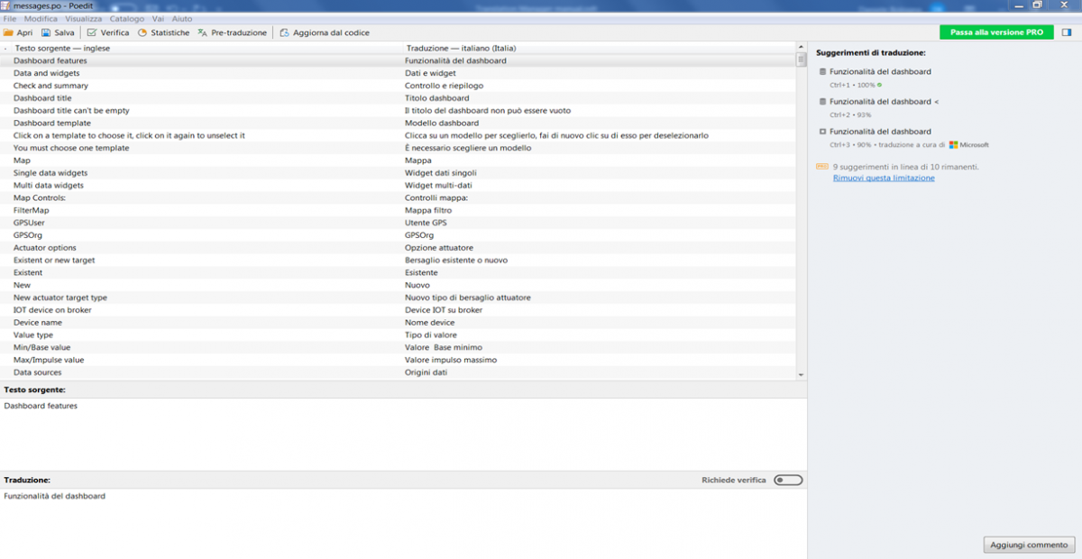 The translation of the texts in the application source code is performed through text-based files in .po format. These files contain a list of the original text strings in various files and it is possible to define the corresponding tradition in a certain language.