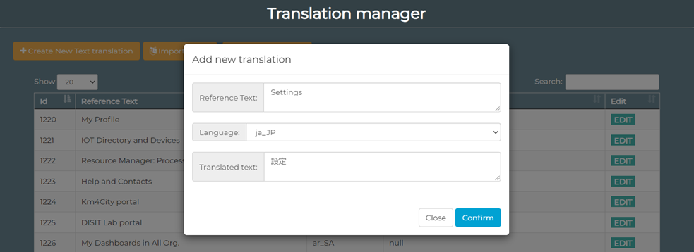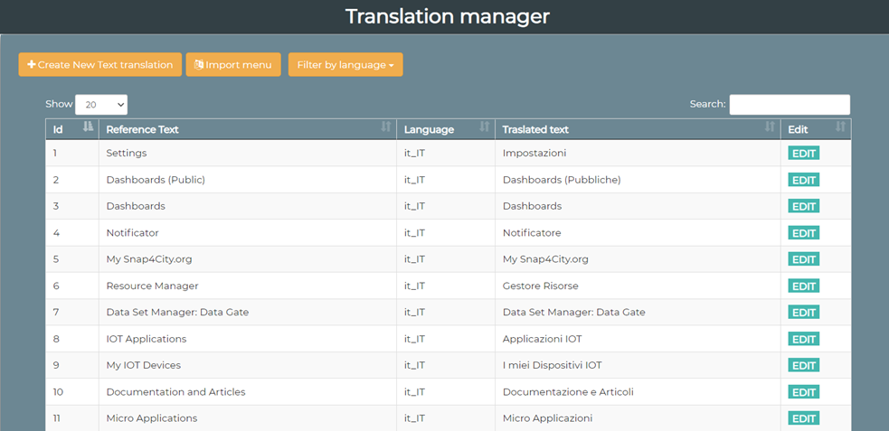 It is also possible for the user to modify an already existing translation using the "Edit" button associated with each element of the table. it is possible to change the language and the translation, but not the original text.