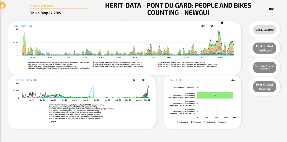 The solution has been developed for Pont du Gard in the context of HeritData for monitoring the old bridge and in terms of tourism and related people flows. To this end, a number of different kind of sensors for counting people and bikes have been connected to Orion Broker by Snap4City solution. The solution also integrates information regarding social media coming from Twitter. Thus, Snap4City solution integrated both people/bike counts/flows and social media to provide a number of dashboards and business intelligence services. Dashboards allow to see real time data and historical data with 3D diagrams, staked diagrams, etc. Some of the produced results are accessible via public dashboards for the citizens and operators. The Snap4City solution for Pont du Gard has been developed by DISIT Lab which is a FIWARE Gold Member, and it is hosted as a tenant on Snap4city.org service.