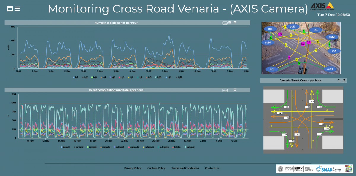 As shown in the dashboard, thanks to one AXIS camera only installed at a crossroad in the city of Venaria Reale is possible to collect the data regarding 12 different vehicles trajectories.