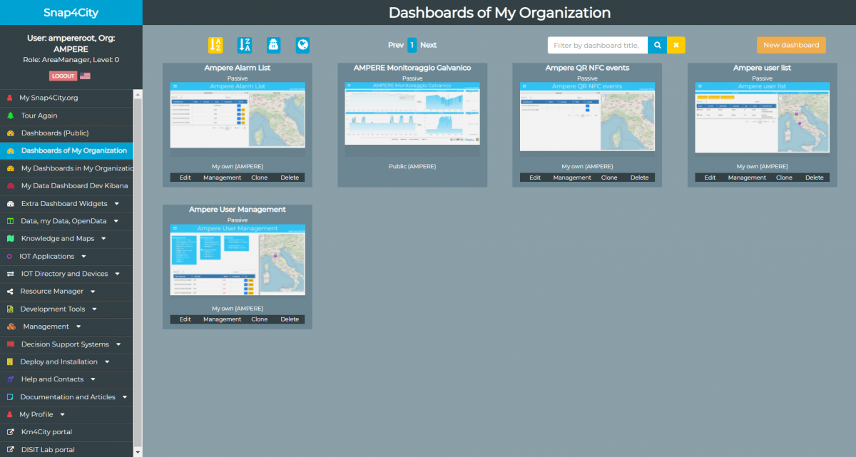 The management is carried out through dashboards that display as widgets “external content” of the html interfaces generated through a nodered IOT app.