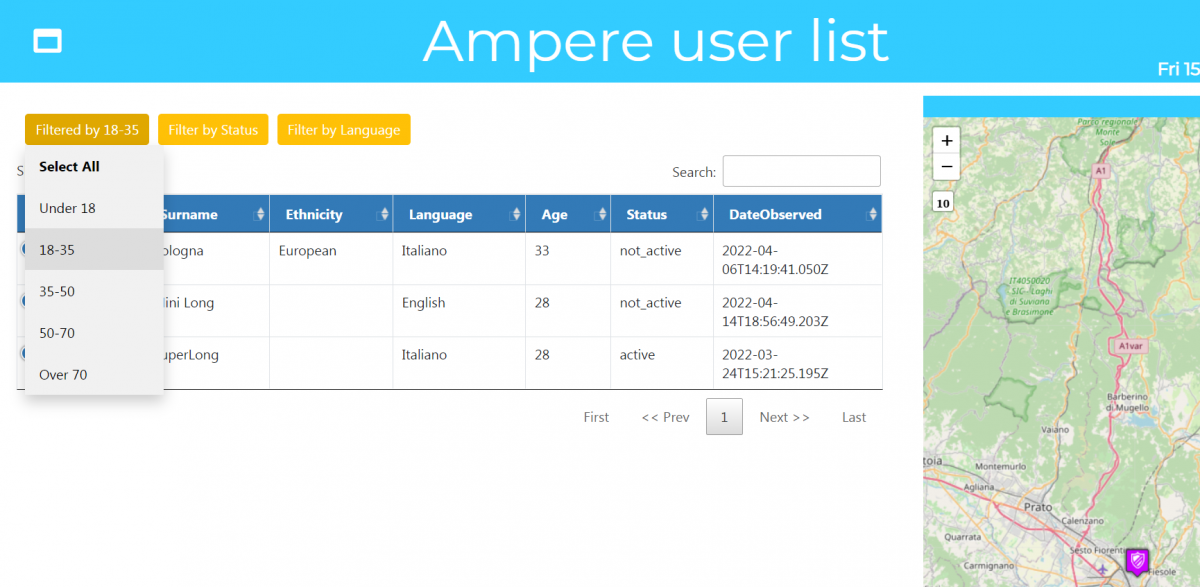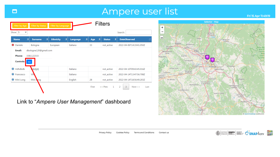 The table has a link to the "Ampere User Management" dashboard corresponding to the user by the “See” button, and a “Pin” button to visualize it on the map by a selector.