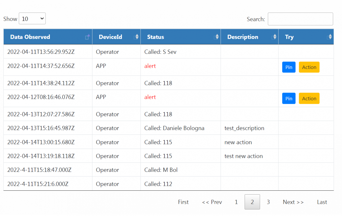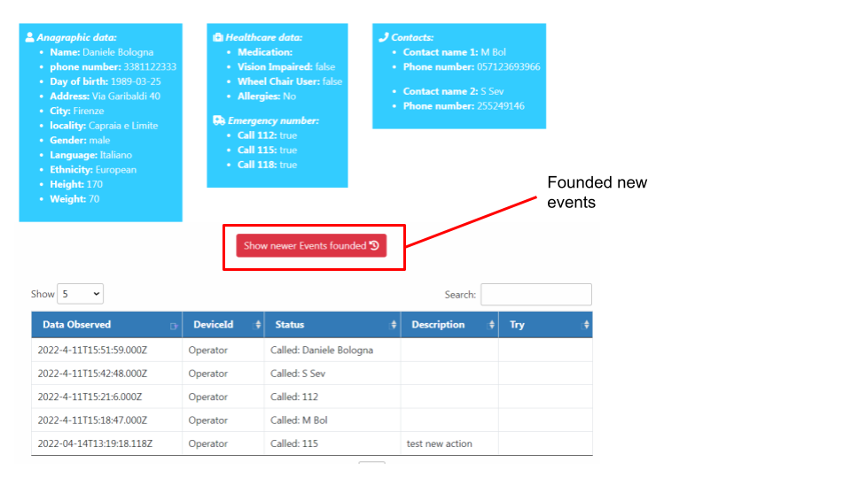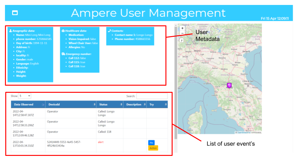 The lower part of the screen instead shows the latest activities concerning the user, extracted through the IOT device with device type "AmpereEvent". The operator sees the alert requests generated by the user and can create an action.