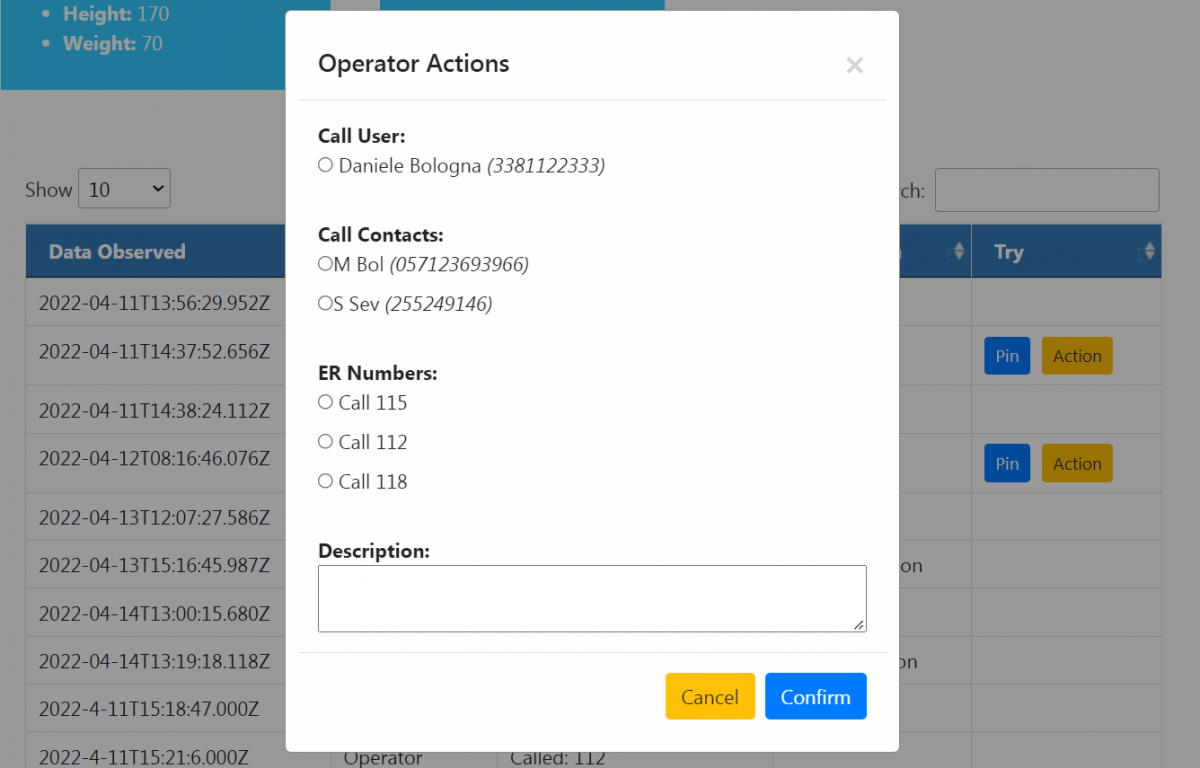 The "action" menu allows the user to notify the device of the event if the operator has made a call to the user himself, to an ER number (if the user has given permission) or to one of the contacts indicated by the user.