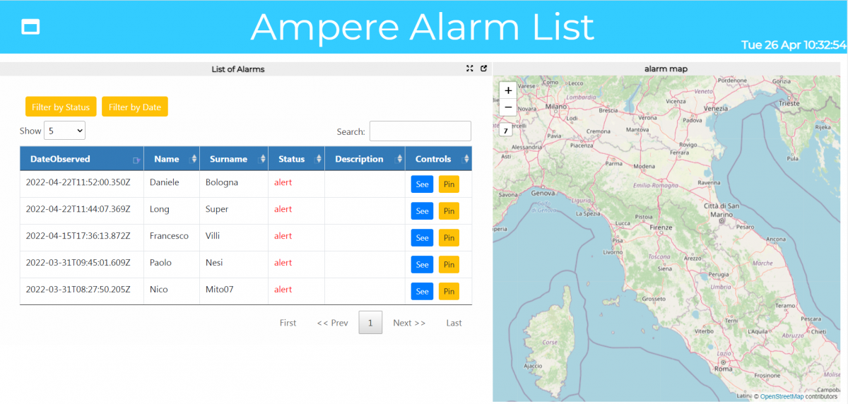 The "Ampere Alarm List" dashboard contains a complete view of the latest event from every user. Unlike the "Ampere User Management" dashboard, no actions can be performed.