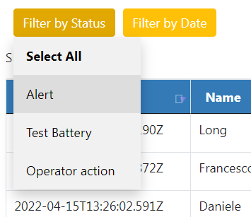 In the “Status” filter the events can be filtered as "Alert", "Test Battery" or "Operator Action".