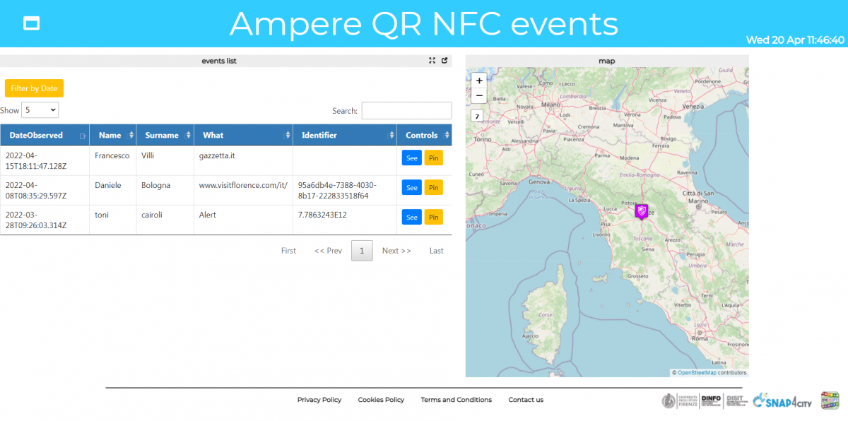 The "Ampere QR NFC events" dashboard contains a complete view of all the readings of a QR or NFC code made by all users.