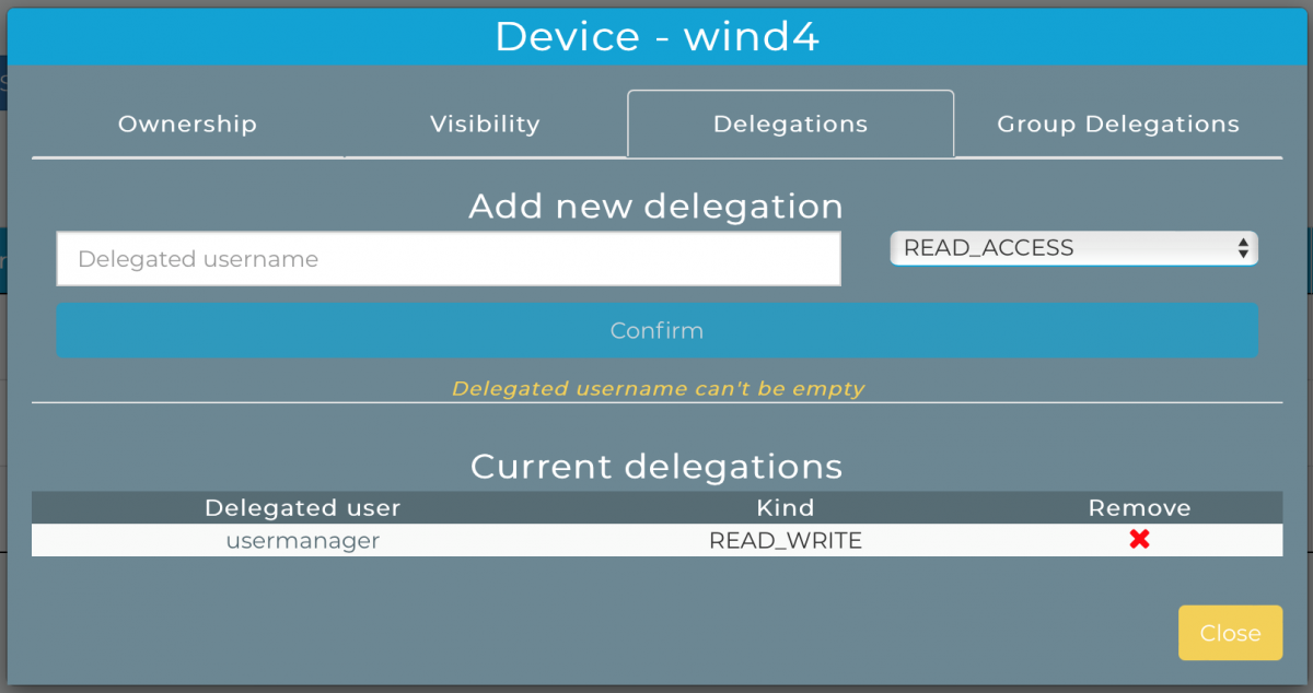 - READ_ACCESS: allows the delegated user to view the device and the data connected to it. This is the minimum delegation level and is used as the default value for each delegation;