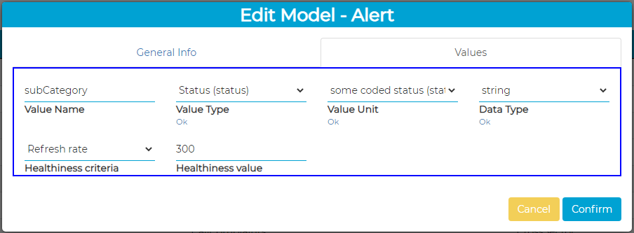 In the second tab, the user must assign for each attributes the value type, the value unit and the data type. Also, if you want, you can change the healthiness criteria and healthiness value.