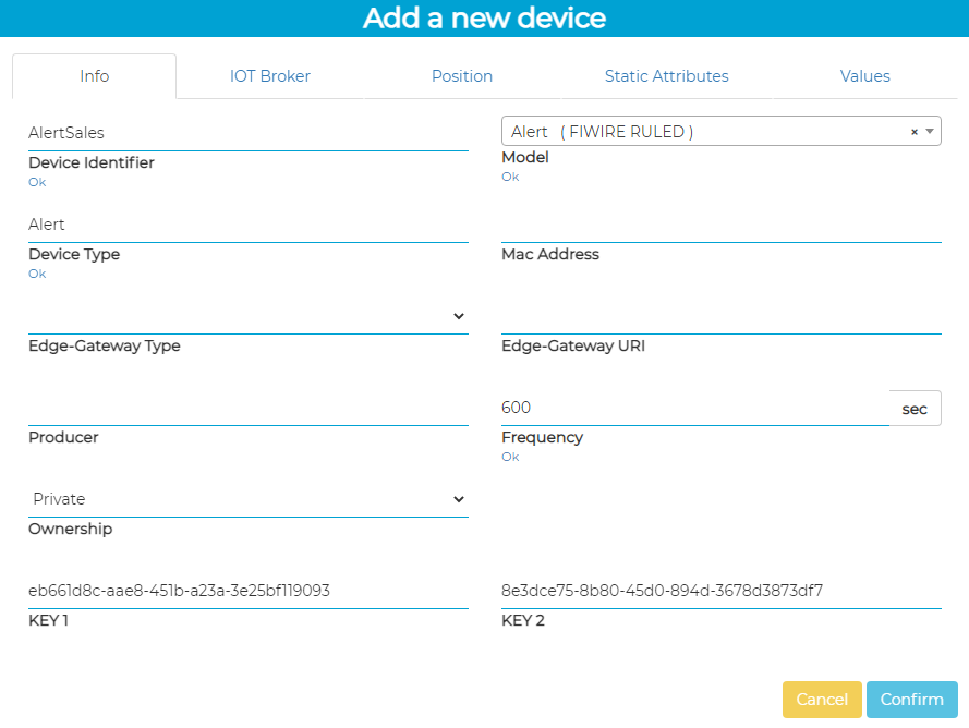 Then the usual form will pop up. So, the user can fill the whole fields while paying attention about the model and the Broker. As is shown in the below figure. For an in-depth study see “HOW TO: Create an IOT Device Istance”.